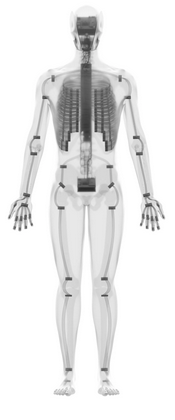 El sistema esquelético del clone contiene los 206 huesos del cuerpo humano con una pequeña cantidad de fusiones óseas. Las articulaciones están completamente articuladas con ligamentos artificiales y tejidos conectivos. Con una ubicación 1:1 de ligamentos y tendones en el esqueleto, el androide es altamente articular e incluye relaciones articulación-músculo de uno a muchos y de muchos a uno. Las cuatro articulaciones del hombro que conectan el omóplato, la clavícula y el hueso del brazo tienen un total de 20 grados de libertad, tanto de rotación como de traslación, con 6 grados de libertad adicionales para cada vértebra de la columna. Con 26 grados de libertad en la mano, la muñeca y el codo, sólo la parte superior del torso del Clone sin las piernas posee 164 grados de libertad.